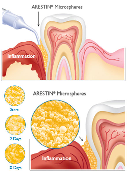 ARESTIN® contains microspheres—tiny, bead-like particles—that are smaller than grains of sand and are not visible to the eye. The microspheres are filled with the antibiotic minocycline hydrochloride. These microspheres release the antibiotic over time, killing bacteria so your gums can heal better than with SRP alone.What to expect as your gums heal